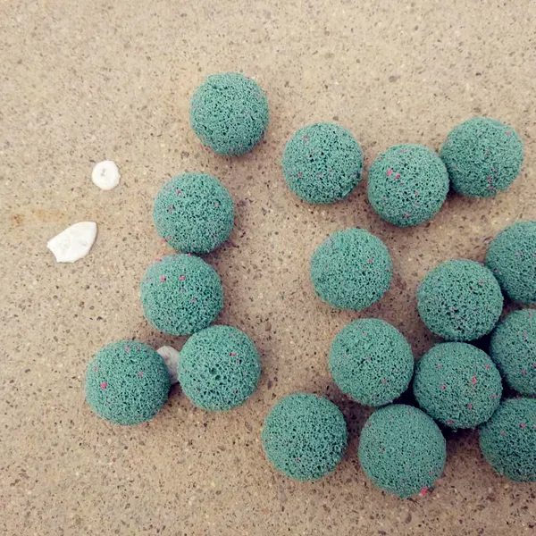 Silicon carbide-coated balls remove calcium carbonate scale, reusable after drying.